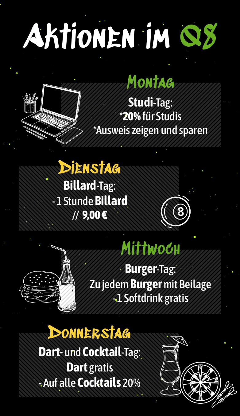 Q8 Sportslounge – where the game comes alive! Unrivaled with our range of darts, pool, table tennis, VR games and events. Let yourself be tempted by our burger specialties and enjoy the get-together in our eventful world.